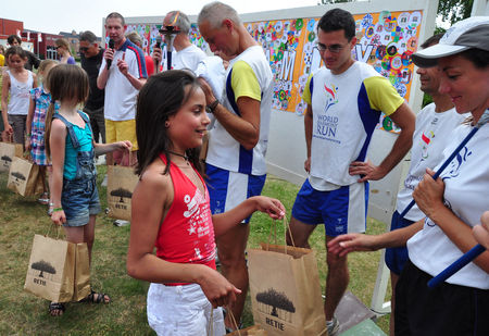 We kwamen deze kinderen tegen onderweg en gaven hun spontaan onze fakkel. Ze vonden het heel leuk om deel te nemen aan de World Harmony Run.