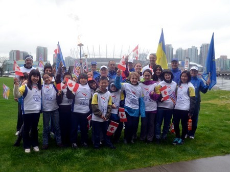 We went back into the city and met with a group of very enthusiastic children from Vancouver Montessori School. We ran a couple of kilometers together, ending at the Terry Fox Memorial Plaza for our ceremony. Being Vancouver, it was raining of course; but no one seemed to mind!