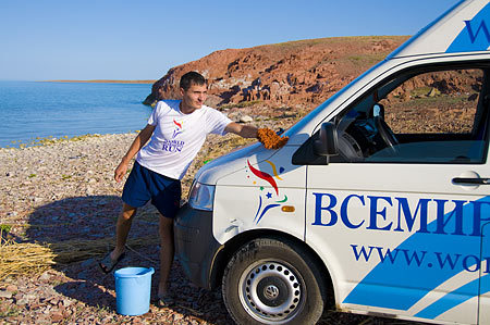Утром из г.Балхаш нас провожали начальник отдела спорта Шакенов Избасар Омиржанович и телеканал «Оркен-Медиа» в лице журналиста Оксаны. Перед стартом мы зашли в мечеть получить благословление у Имама мечети г.Балхаш. Местные ребята и журналист телеканала с радостью пробежали с факелом 100 м и вдохновились снять репортаж о посещении командой детского лагеря на берегу озера Балхаш.