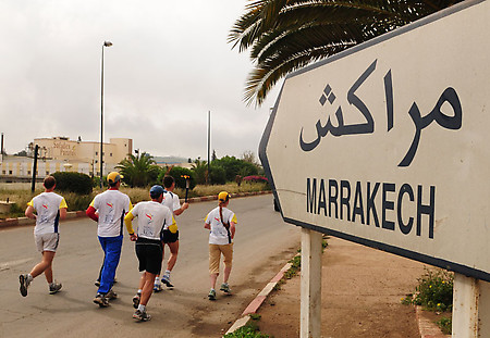 We can see Benguerir to our left as we crest a small hill. Straight ahead of us is Marrakech, but reaching it is a task for another day.Vladimir from the Ukraine has run many miles today; they are useful in his training for an upcoming multi-day race. Team captain Ondrej has run many miles as well, but taken many, many more photos. Patricio has run a lot, but like me he spends much of the day behind the wheel of one of the Renaults. Mario and Rasto, the two cheerful Slovaks, seem inexhaustible. Moroccan organizer, Johnny, runs and talks often on his phone, and never seems to sweat. And the two girls, Martina and Mila add miles and charm to a group of otherwise rough-and-ready boys.