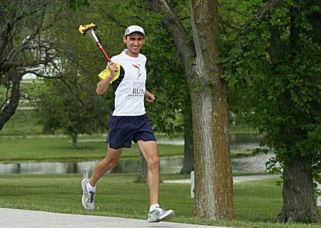 The torch took us through the farms and fields of Kansas to Anderson County Jr. and Sr. High School. Although the Seniors had finished school the day before, everyone from 7th to 11th grade came down to the gym to welcome us. Reagan Rockers, Secretary of the Student Body, ran into the gym with us holding the torch.